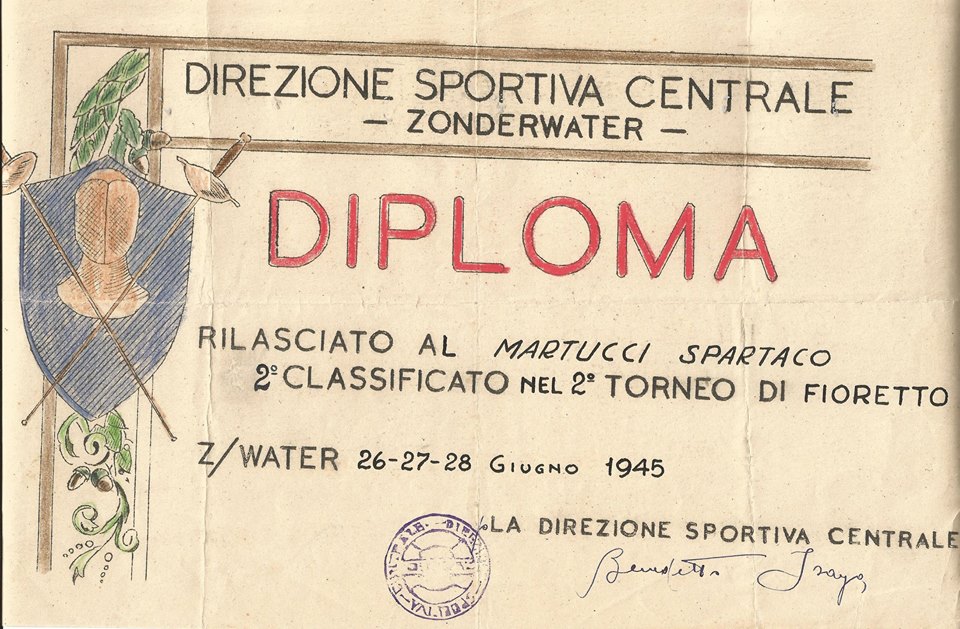 Fencing Competition Diploma. The competition was held in Zonderwater 26, 27, 28 June 1945. Martucci finished in second place (foil).