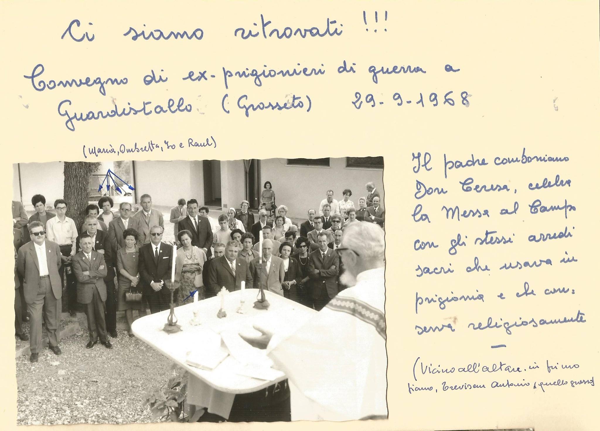 Handwritten comments by Spartaco Martucci: 'Ci siamo ritrovati!!! Convegno di ex-prigionieri di guerra a Guardistallo (Grosseto). 29-9-1968. (Maria, Ombretta, io e Raul). Il padre comboniano Don Ceresa celebra la Messa al Campo con gli stessi arredi sacri che usava in prigionia e che conserva religiosamente - (Vicino all'altare, in primo piano, Trevisani Antonio, quello grosso)'. Translation: 'We met again!!! POWs gathering in Guardistallo (Grosseto). 29-9-1968. (Maria, Ombretta, myself and Raul). Comboni Father Don Ceresa celebrates Mass at the camp with the same liturgical furnishings he used in captivity and which he religiously preserves - (Near the altar, in the foreground, Trevisani Antonio, the big one)'.