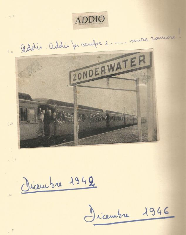 Photo with POWs on a train departing from Zonderwater to be repatriated, December 1946. Handwritten comments by Spartaco Martucci: 'Addio, addio per sempre...e senza rancore! Dicembre 1942 - Dicembre 1946'. Translation: 'Goodbye, goodbye forever... and no hard feelings! December 1942 - December 1946'.