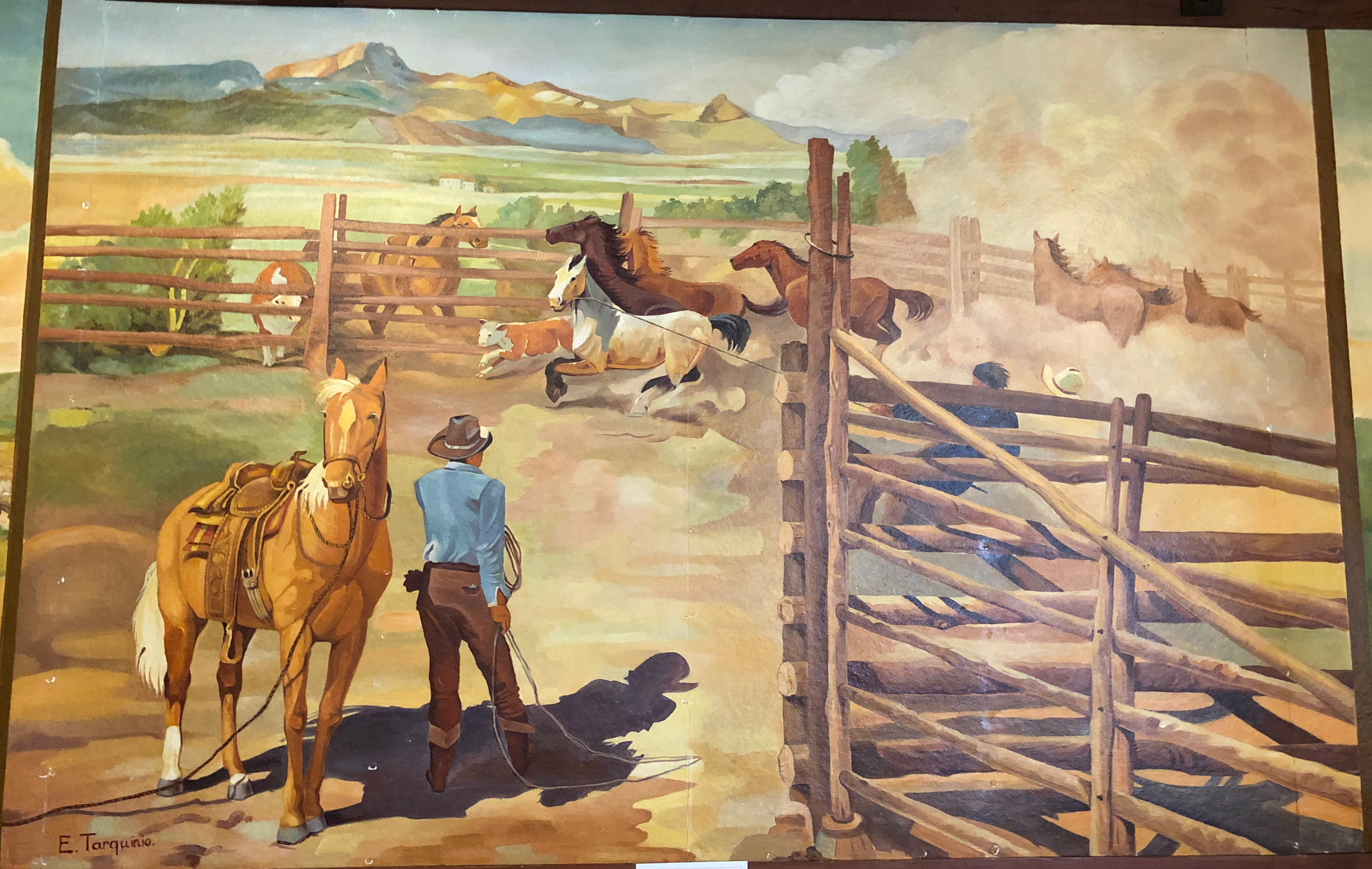 - Horse Round-up in Corral is an oil-painted mural by Enzo Tarquinio in the Officer’s Club in Camp Douglas. It is located in the Bar Room. Measurements in inches: 105”w x 68”h