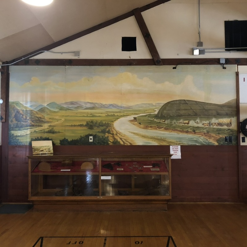 Independence Rock is an oil-painted mural by Enzo Tarquinio in the Officer’s Club in Camp Douglas. The mural is located in the Main/Dance Hall, facing the Pool Room, on the wall nearer the kitchen, to the right. Painted between Oct 1943 and April 1944. 'When Enzo Tarquinio copied William Henry Jackson’s painting of a wagon train passing Independence Rock, he stayed close to the original on the right. But the left half of the picture is from his own imagination, and its landscape looks, perhaps, more like Italy than Wyoming' (Laura Ruberto, https://www.wyohistory.org/encyclopedia/italian-painter-wyoming-pow-camp). Measurements in inches: 199”w x 68” h.