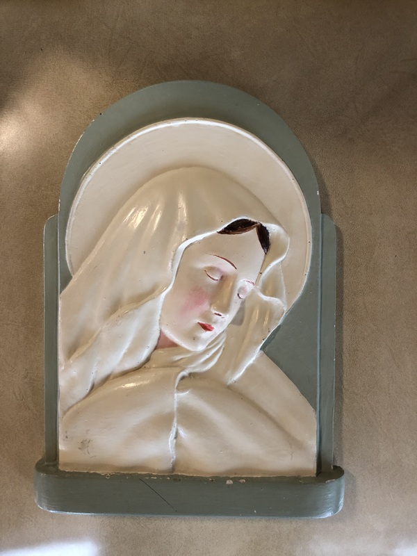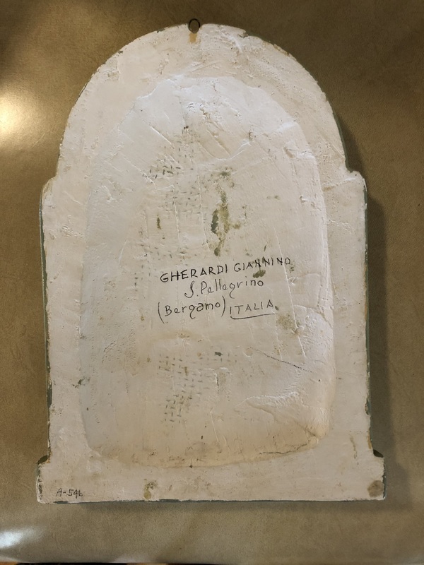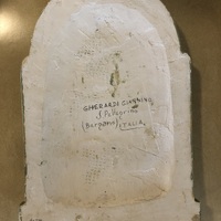 - Bas-relief sculpture on a slab, with a concave back. Recto, three-quarter view of the Madonna with closed eyelids. Her clothes and the halo are white on a grey background. A finger emerges from the mantle. Verso, Gherdardi's name and place of birth