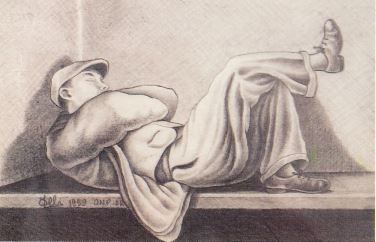 - Man lying down with eyes closed, arms crossed, right leg crossed over the left