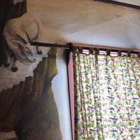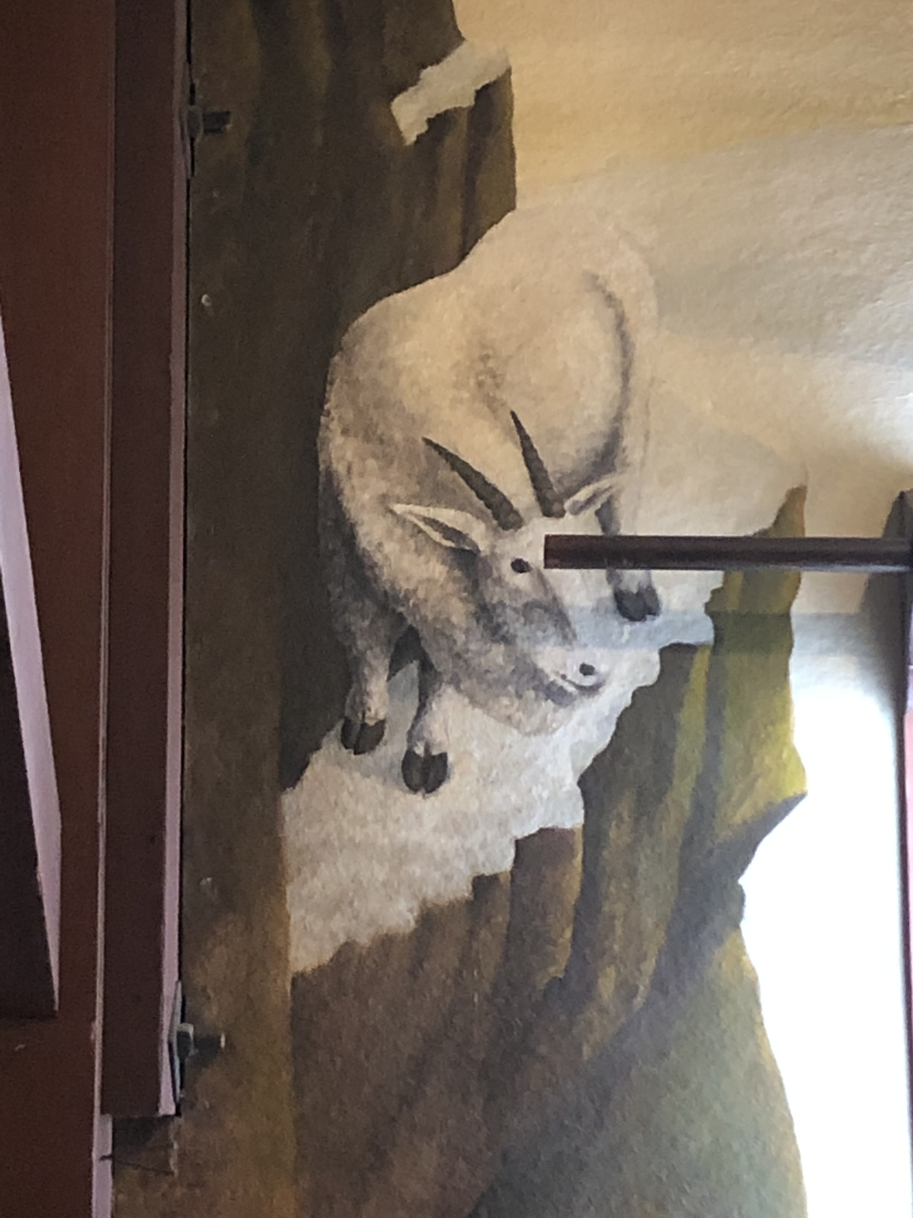 - Mountain Goat on a Bluff is an oil-painted mural by L. De Rossi in 1944 in the Officer’s Club in Camp Douglas. It is located in the Bar Room and it goes around a window. Measurements in inches:105'' w x 71” h