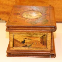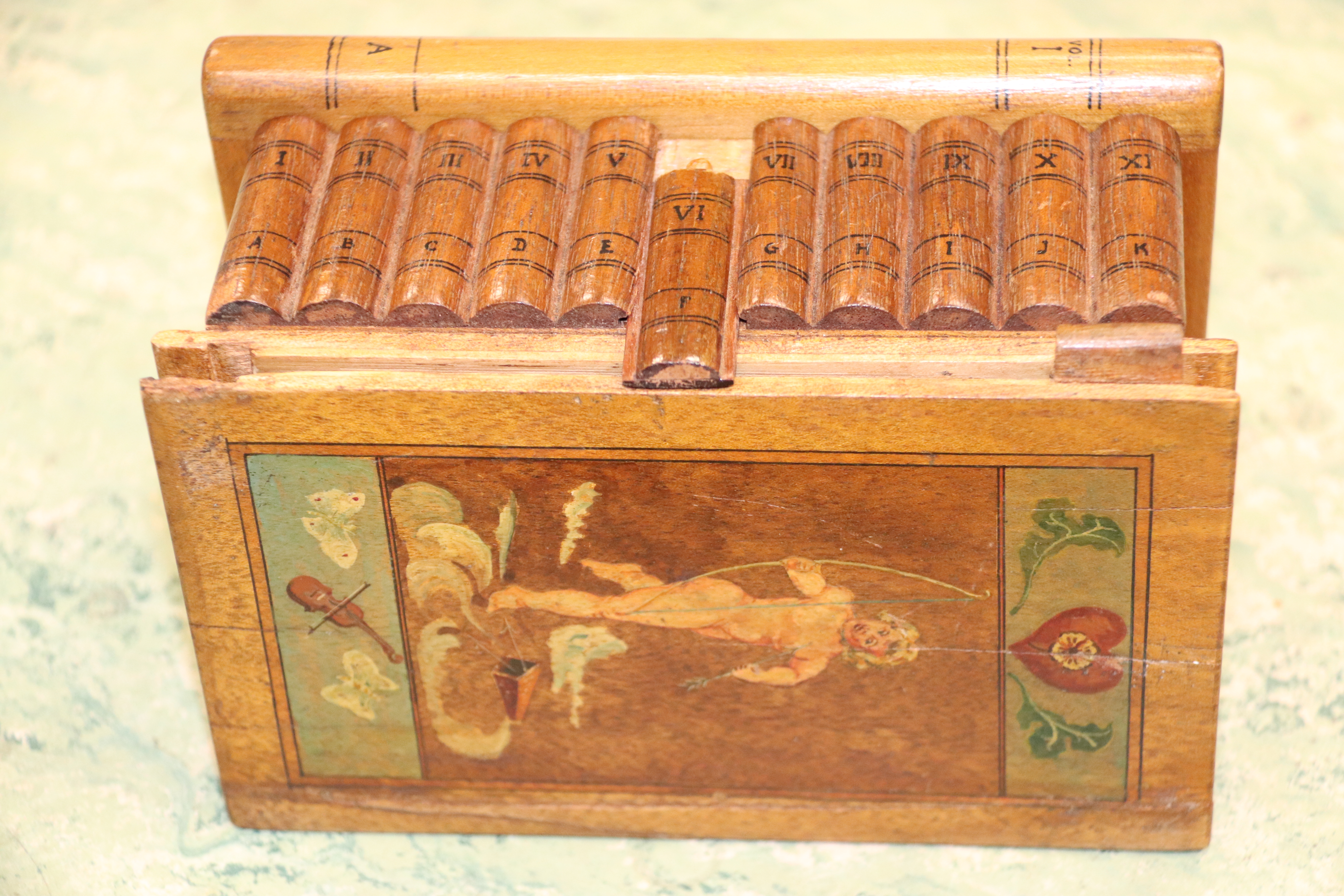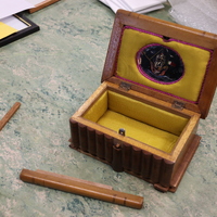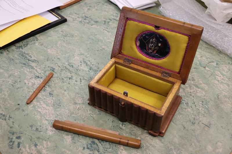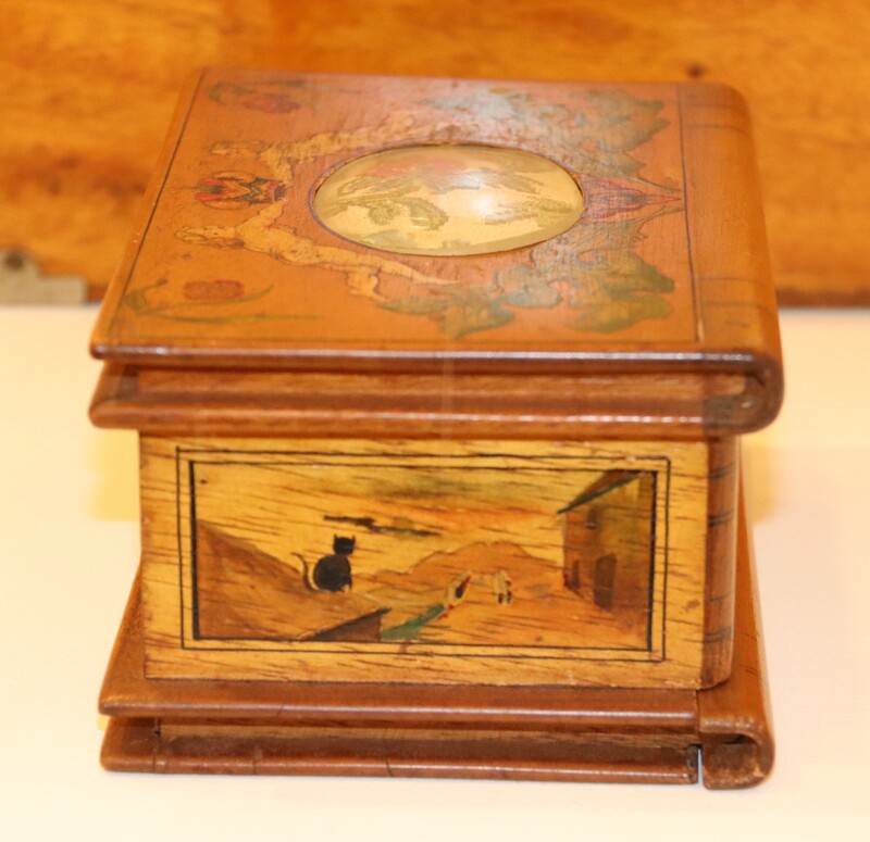 A wooden trinket box that that imitates a book shelf. The box was given to Mrs Sylvia Baker, the daughter of Mr Roland McDiarmid who owned an experimental farm where Prisoners of War including Eliseo Pieraciini worked. The trinket box was passed down from Mrs Sylvia Baker to her daughter Roslyn Pearce who donated it to the Cowra and District Historical Society and Museum Inc. in 2023.