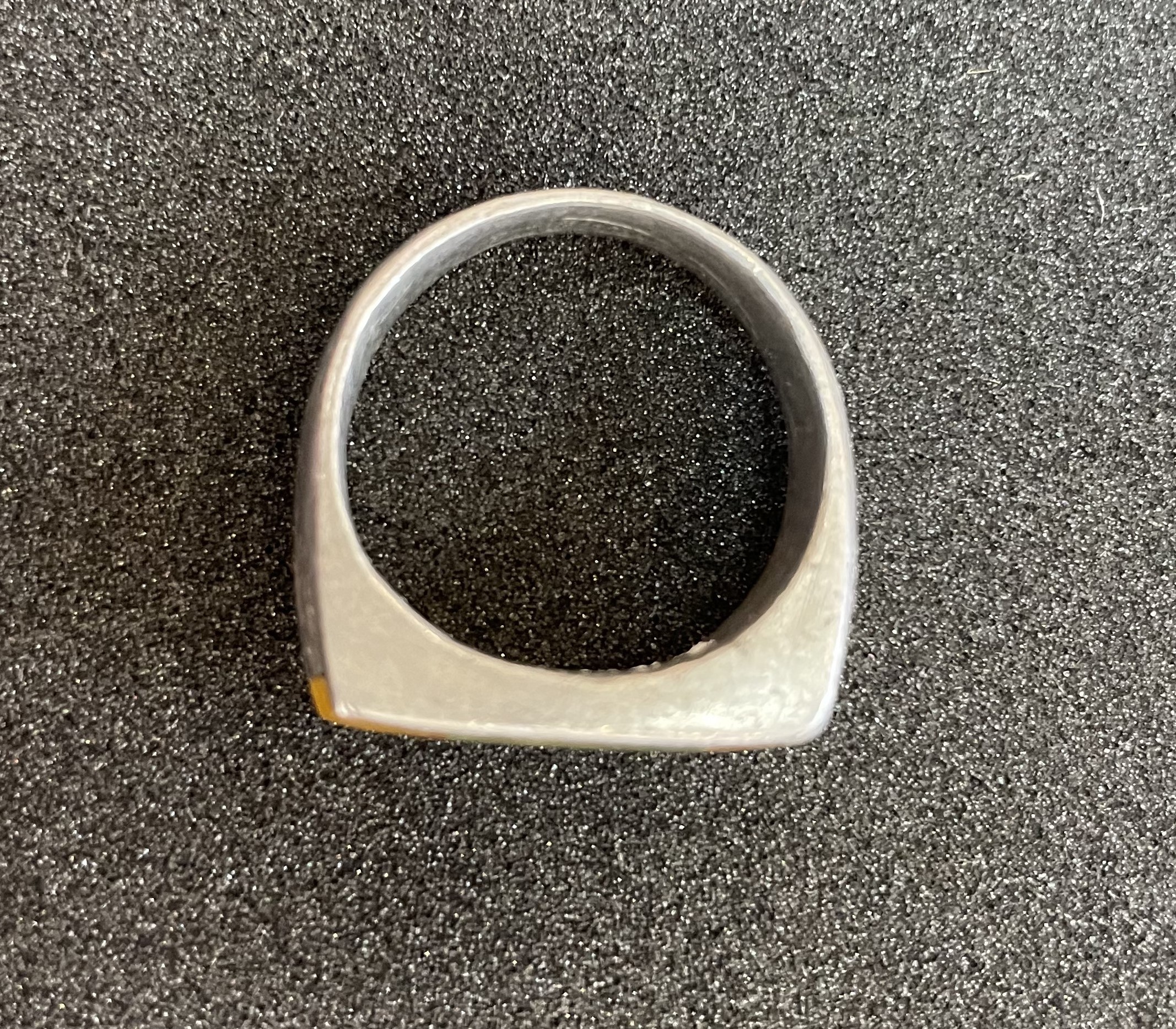 - A silver aluminium finger ring made from crashed aircraft materials, the ring is circular and the front is inlaid with pieces of yellow perspex plastic (Imperial War Museums)