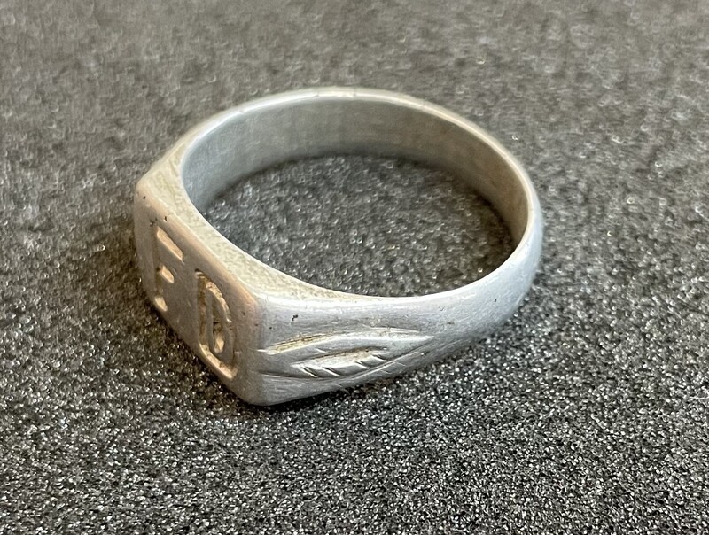 - A silver aluminium ring made from crushed aircraft materials, the ring is circular and hand-engraved with the initials 'FD' on the front and, on either side, is simple foliate (Imperial War Museums)